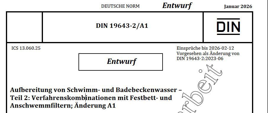 * E DIN 19643-2/A1:2026-01, Aufbereitung von Schwimm- und